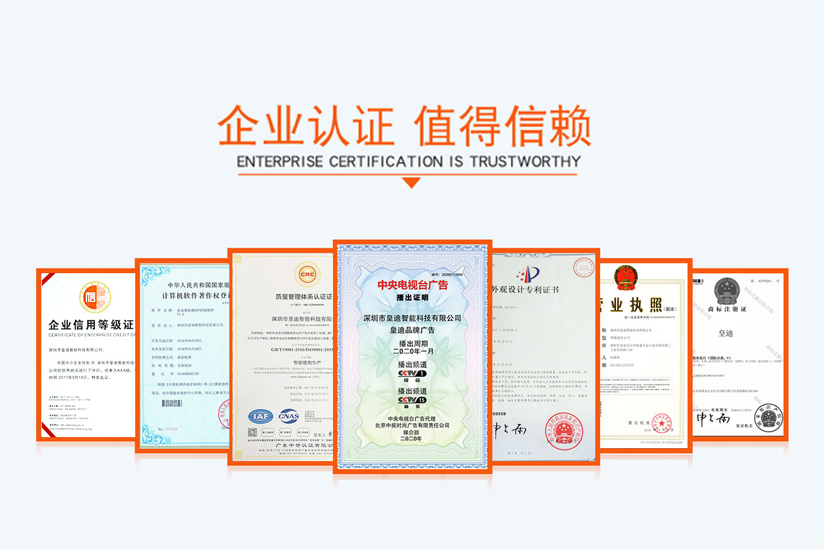 深圳市皇迪智能科技有限公司,是一家集產(chǎn)品研發(fā)、制造、銷售、安裝、售后于一體的全產(chǎn)業(yè)鏈公司,我司專注于酒店刷卡鎖、公寓藍(lán)牙密碼鎖、電子鎖、密碼鎖研發(fā),生產(chǎn),銷售.是國家高新技術(shù)企業(yè),公司已通過ISO9001/2015標(biāo)準(zhǔn)認(rèn)證,并擁有多項國家實(shí)用新型專利、外觀專利及計算機(jī)軟件著作權(quán); 皇迪玻璃門鎖廠家一直秉承“以顧客為中心,以人為本,長期艱苦奮斗”的經(jīng)營理念,為全球每一位消費(fèi)者提供舒適,便捷,安全的高品質(zhì)生活。